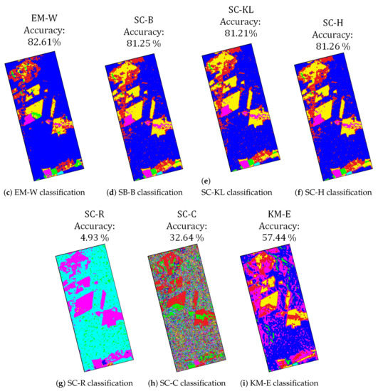 We applied the seven classification algorithms above-cited on PALSAR image, and compare the results of the classifications against the Truth map. The results show that, as for simulated images, the EM-W (Figure 11c), SC-B (Figure 11d) and SC-H (Figure 11f) had the good overall accuracy results (82.61% and 81.25% and 81.26%, respectively), closed followed by the SC-KL with of overall accuracy. The KM-E algorithm achieved , especially due to misclassifying of Agriculture 3 class, Bare Soil and Pasture. As for simulated images, the worst classification accuracy results came with SC-R and SC-C algorithms, having and , respectively.