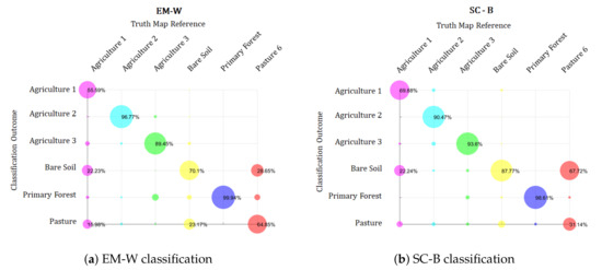 Figure 11 shows the results for PALSAR image and Figure 12 shows the respective confusion matrix bubble graph. We consider only the regions highlighted at the Truth map for initial centroid determination, confusion matrix determination and overall accuracy classification computation. As for simulated images, the overall accuracy was computed by the confusion matrix, where the true values were given by the Truth map, and the outcome values were given by the classification result. Since this image is a not simulated PolSAR image, the speckle is not controlled, therefore more confusion between classes is expected. We can see that the confusion matrices graphs displayed in Figure 12 are more dispersed than the confusion matrices graphs showed in Figure 7.