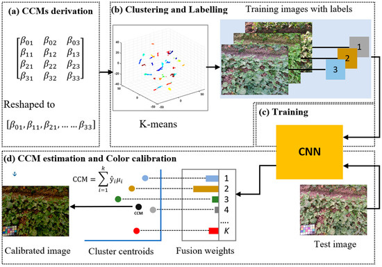 We proposed to combine the k-means algorithm and deep learning to calibrate the color of our images. Specifically, our proposed framework includes four main steps, as described in Figure 1: (a) the color calibration matrix of each image was firstly computed (ground truth, it should be noted that the manually derived CCM is a ground truth to the final CCM estimated using CNN. The reader should not confuse between this ground truth and standard color values supplied by the X-Rite company.); (b) the training images were categorized based on the color calibration matrix allocated to each image sample; (c) a labeled image dataset was then used to train and validate self-designed deep CNN, and the system was trained to assign scores to a given image to belong to each CCM cluster with some degree of membership; and (d) the CCM of a testing image was calculated by combining the outputs of our deep learning CNN and cluster centroids of the k-means algorithm.