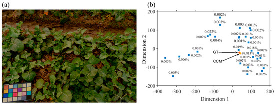 The digital camera has emerged as an essential tool for high-throughput plant phenotyping, and it is widely used to reveal genotypic traits associated with the structure and color of plants. The reliability and repeatability of these traits are highly related to the color constancy of the images [1]. However, images acquired using different digital cameras (or the same camera with changing its settings) produce an inconsistent color, due to the different specifications (e.g., spatial resolution, spectral responses, and signal-to-noise ratio). Moreover, images captured using the same camera at different points in time and dates could vary in color, despite no changes in the object (e.g., plant) characteristics. In such cases, the variability in the image color is a result of sunlight intensity, sun inclination angle, temperature, and other prevailing weather conditions. Such variations in image color have a serious influence on the evaluation of plant physical, chemical, and biological characteristics when color is considered as a relevant and significant trait in studying plant phenotyping [2,3].