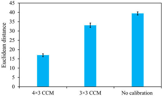 The CCM derivation is a very critical step in our framework because the CCMs manually derived from whole image samples will finally be combined into one optimal CCM, as described in Section 2.2.4. As depicted in Figure 4, the proposed CCM derivation method reveals that when adding bias or a translation component to the CCM, the color difference between the measured and reference color values was less than 17 ΔΕ, while it was larger than 30 ΔΕ by using 3 × 3 CCM. The color model plays a key role in the color calibration process and can significantly influence the calibration accuracy. This study only used sRGB color space for color calibration, therefore the influence of different color spaces is a topic for future research. Since the digital camera produces non-linearized gamma-corrected images, the linearization of gamma-corrected sRGB color space is an essential step when using sRGB color space with multivariate linear regression. Because the CCM derived by multivariate linear regression only performs a linear transformation, it cannot work well with sRGB color space without removing gamma-correction or linearizing the image. Otherwise, high-order polynomial regression is highly recommended to obtain the mapping coefficient matrix without image linearization [54].
