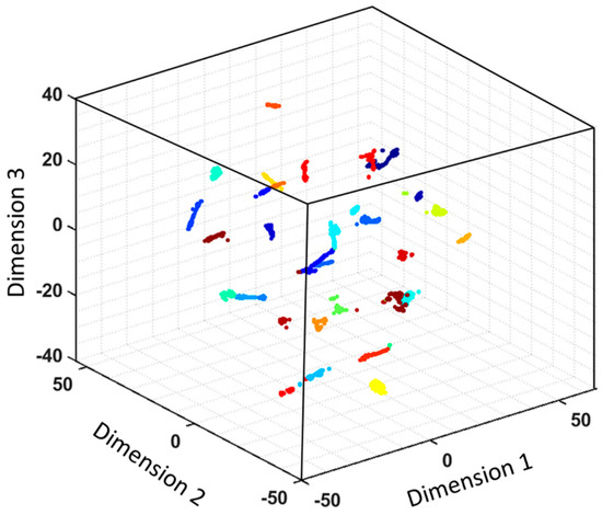 A t-distributed stochastic neighbor embedding (t-SNE) visualization of color calibration matrices (CCMs) corresponding to the images collected from the field. Each color represents a different class in the datasets. Note that the CCMs belonging to the same class were grouped.