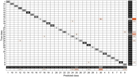 Figure 6 shows the confusion matrix for the CNN classification performance. Our results show that most of the classes were correctly classified with a precision and recall of 100%. Class 17 was partially confused with class 30, which could be due to the similarity between the illumination of two classes.