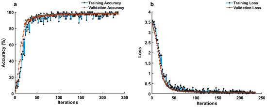 Training and validation accuracies (a) and losses (b) of each iteration of the training and validation processes of the convolutional neural network (CNN) classification algorithm.