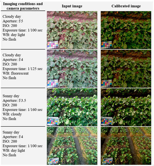 Generally, the color calibration methods can be divided into two groups: (i) device-based methods and (ii) image-based methods. The former approach has been investigated in several studies, in which the sensor of the camera was established to automatically adjust the color values based on the scene lighting conditions [17,18]. While the latter methods are used to compensate for color distortion due to variations in illumination conditions or different responses of camera sensors. The image-based approach is the most popular way to preserve the same color tone in object scenes and it often uses a standard color chart to transform the pixel values of an image to the target color values measured under know-illuminant [19,20]. Various types of relationships between pixel values of the image and the reference color values have been already established in the literature. For instance, color calibrations using least-squares polynomial regression [21,22,23], linear regression [24], and neural networks [25] were previously established, and they have been applied successfully in different areas such as dentistry [26], photography [27,28], printing technologies [29], and the food industry [24,30]. However, there is insufficient information about color calibration for agricultural applications. Akkaynak et al. [31] introduced a color calibration method using a color calibration chart. This method performed color calibration using a three-dimension (XYZ) color space and then converted the image into the RGB color space for better display. Shajahan et al. [20] developed an efficient semi-automated color calibration method using linear regression. In their method, the optimum number of color patches of a color chart that can provide accurate image calibration was specified. Although the regression-based methods are computationally inexpensive and do not need training datasets, their real-time applications under in situ field conditions are difficult, particularly for plant phenotyping whereby a large number of images are commonly collected on a daily basis. Also, these regression-based methods are time-consuming, laborious, and require the color checker to be included in every image. An automated and efficient approach for image color standardization is therefore highly required.
