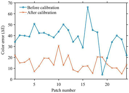 The quantitative analysis results of the differences between the measured and reference colors before and after the color calibration are presented in Figure 9. It was observed that the measured color errors were smaller for the calibrated image (ranging between 4.9 ΔΕ and 30.70 ΔΕ) than those in the original image (ranging between 4.20 ΔΕ and 66.00 ΔΕ), indicating the colors of the color-corrected image better agreed with the reference colors in most color patches, except in the patch 19 whereby the measured color error of 20.2 ΔΕ was relatively high.