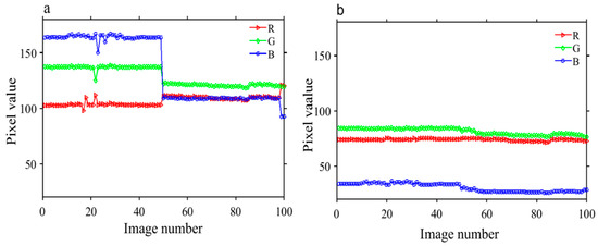 Figure 10 shows mean canopy color in RGB channels for 100 images of a single oilseed rape plot acquired under different illumination conditions using different camera parameter settings. The aim of this figure is not to prove the mean color intensities themselves, but rather to describe the constancy of color measurements over different conditions and varying camera parameter settings. The color before calibration implies too severe changes in color to be associated with a biological phenomenon, as shown in Figure 10a. Although all images were collected from the same plot, the mean color intensities varied among image sessions due to the different illumination conditions and camera parameter settings. While the intensity remained more consistent after the color calibration, as presented in Figure 10b. It was also noted that the color corrected images had consistently higher green intensity than red and blue due to the high chlorophyll content at the seedling stage. While at the senescence stage, the red value is expected to be increased, as plants begin to turn yellow with decreased chlorophyll content (data was not shown here) [55]. It would be very difficult to observe such chlorophyll-related changing patterns of plants from RGB images without color calibration.