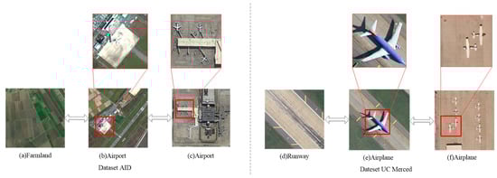Some example images for remote sensing image scene classification. (a–c) denote the farmland, airport and airport from dataset AID, respectively. (d–f) denote the runway, airplane and airplane from dataset UC Merced, respectively.