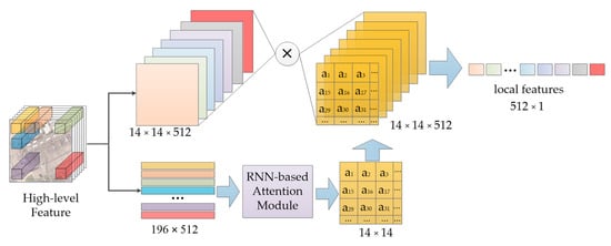 Compared to global feature, a local feature should focus on the information of silent regions in the image to further improve discriminative ability. The original image is usually divided into small image blocks, then used for extracting local features, which may be the usual pipeline of local feature extraction, such as the proposed multi-patch pooling [41]. In our method, an end-to-end local feature extraction framework is proposed and combined with the global feature extraction module, based on the high-level feature of deep CNNs. As shown in Figure 4, the image size drops from 224 × 224 to 14 × 14 through the pooling operation in CNNs. Every pixel (1 × 1) in high-level feature corresponds to the original image block with the size of 16 × 16. The vector of 1 × 1 × 512 in the high-level feature can, therefore, be treated as the regional feature with the original size of 16 × 16. Based on the above analysis, we take the sequence of local high-level feature as an input and design an RNN-based local feature extraction module with attention mechanism to model the local features and spatial context information. With this, a reweighed weight mask is learned to reweigh the importance of different image blocks.