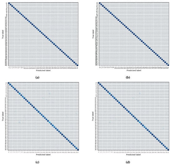 The CMs on dataset NWPU45: (a) The CM of ResNet_LGFFE under the training ratio of 10%, (b) The CM of ResNet_LGFFE under the training ratio of 20%, (c) The CM of Finetune_ResNet50 under the training ratio of 10%, and (d) The CM of Finetune_ResNet50 under the training ratio of 20%.