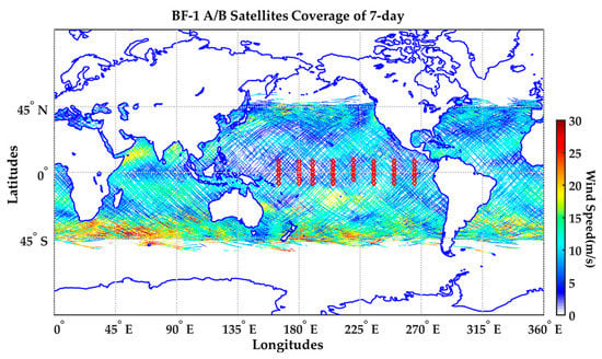 The places studied are limited by orbital configurations. The BF-1 A/B satellites operate at altitudes of 579 km with an orbital inclination of 45°. In fact, within the antenna footprint, the specular points are scattered from latitudes 53°S to 53°N, as shown in Figure 1. This area can cover most of the typhoon events [] and coastal lines of China. The other study area is also shown in Figure 1 of the central equatorial Pacific Ocean, where the red diamonds are the 55 mooring buoys deployed by the Tropical Atmosphere Ocean (TAO) program of the National Data Buoy Center (NDBC).
