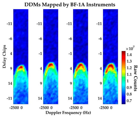 Each GNSS-R receiver collects four DDMs per second for 24 h each day. In this mission, the world’s first in-orbit BDS DDM was mapped on 10 June 2019 and its first DDM was acquired on 9 June 2019. The in-orbit-measured DDM has dimensions of 128 × 21, corresponding to 32 delay chips in quarter chip increments and a 5000 Hz Doppler frequency with 250 Hz intervals. Examples of DDMs measured by the BF-1A instrument are shown in Figure 2.