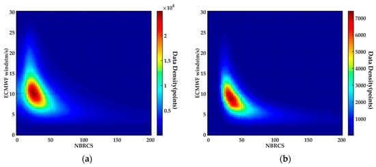 Therefore, after the antenna pattern gains control of a 3-dB beam-width and SNR of 4-dB quality control, 80% of the data were employed as the training set; the remaining 20% was used to validate the model accuracy. The scatter density plot after quality control of the antenna pattern and SNR is shown in Figure 3b. Notably, by setting up the filters of the antenna gain control and SNR threshold, the NBRCS ambiguity problem of moderate wind speeds between 5 and 15 m/s can be largely mitigated from the rate of 16.86% to 1.59%, which effectively improves the performance of the empirical GMF.