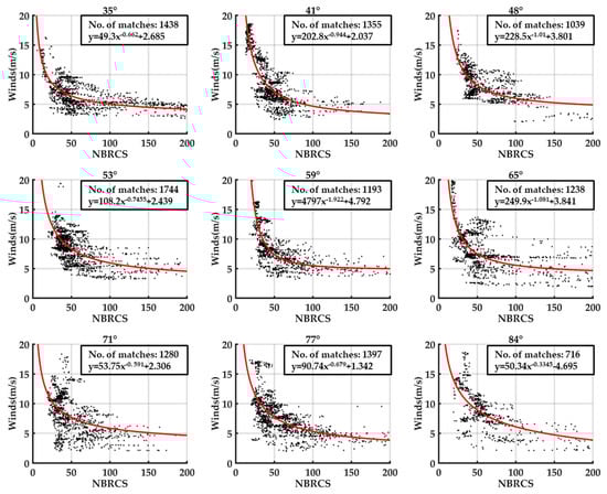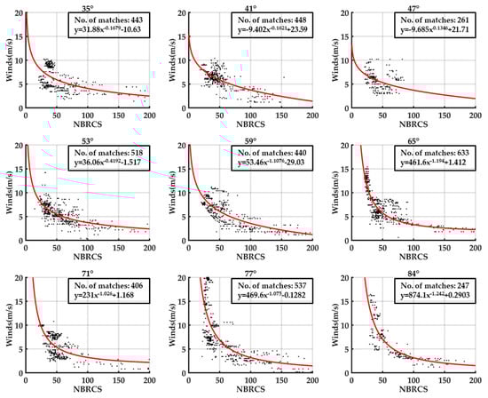 BF-1B channel 2 examples of empirical geophysical model functions (GMFs) at elevation angles of 35–84°. The fully developed sea (FDS) GMF trained by the advanced scatterometer (ASCAT) observations follow the power function form. The red curves are the best-fit functions of the corresponding elevation angles. The coefficients of the power functions are within the text boxes.