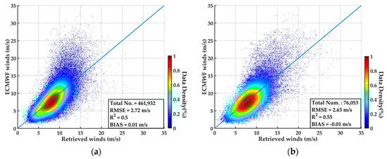 Scatter density plots of GMF-derived wind speeds against ECMWF reanalysis dataset. The colors (from cool to warm) represent the percentage of the maximum number of the densest bin. The GMF-derived winds are on the horizontal axis and the ECMWF reanalysis data are on the vertical. (a) With the time distance of 1 h, the unbiased RMSE is 2.72 m/s, and the coefficient of determination is 0.5. The ECMWF reanalysis wind speed range is 0.6–36.7 m/s, and the retrieved result is between 0.6 and 36.1 m/s. (b) For 10 minus the alignment criteria, the unbiased RMSE is 2.63 m/s with the coefficient of determination of 0.55. The reanalysis wind speed range is 0.9–32.7 m/s, while the derived winds are 0–34.3 m/s.