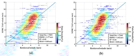 Scatter density plots of GMF-derived wind speeds against NDBC TAO buoy measurements. The colors (from cool to warm) represent the percentage of the maximum number of the densest bin. Results of FDS GMF trained by (a) ECWMF reanalysis data and (b) ASCAT observation data.