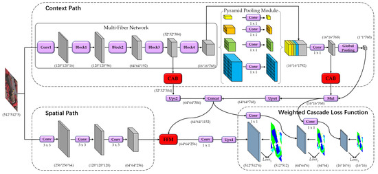 Architecture of the proposed real-time dense semantic labeling network with the dual-path structure. It consists of the spatial path, the context path (multi-fiber network followed by pyramid pooling module), the channel attention block (CAB), the feature fusion module (FFM) and the weighted cascade loss function. Mul: multiplication.