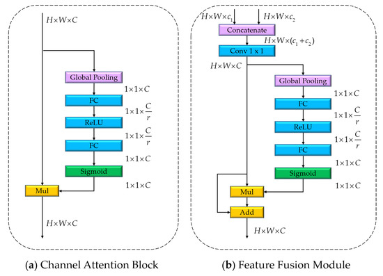 Structures of the channel attention block and the feature fusion module. Mul: multiplication. FC: fully connected layer. ReLU: rectified linear unit.