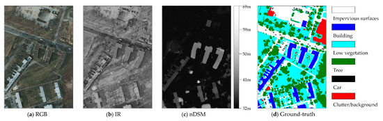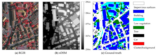 The Vaihingen dataset shows the scene of a relatively small village, Vaihingen, in Germany. It consists of 33 images with the approximate resolution of 2500 pixels × 2500 pixels. Among them, 16 images are offered for training and 17 images are preserved for testing. Each image contains 3-channel data of red, green, and near infra-red with the corresponding DSM. The spatial resolution of each image and the corresponding DSM is about 0.09 m, and the manually annotated ground-truth of pixel-level is available for all the images too. In this work, we concatenate the 3-channel image and the nDSM to form a 4-channel data as the network input. Therefore, the input channel of the first convolution layers in both paths is set to 4 in the experiments related to the Vaihingen dataset. The detailed descriptions are shown in Table 1, and Figure 6 and Figure 7 shows example images of these two datasets respectively.