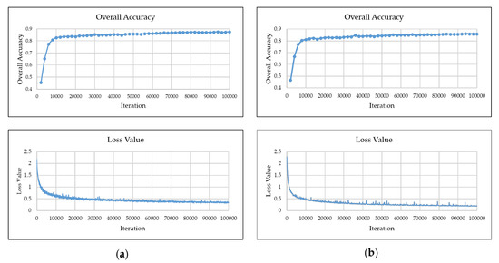 Training plot of loss value and overall accuracy on two datasets. (a) The loss value curve and overall accuracy curve on Potsdam dataset. (b) The loss value curve and overall accuracy curve on Vaihingen dataset.