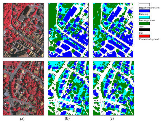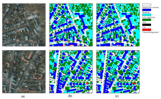 Example results of the proposed model on the Vaihingen dataset. (a) RGIR remote sensing images. (b) Manually annotated ground-truth. (c) Prediction maps of the proposed model.