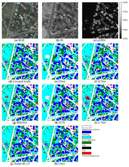 A sample of the comparison prediction results from different models on the Potsdam dataset. (a) RGB image. (b) Near infra-red. (c) normalized DSM. (d) Corresponding ground-truth. (e) Result of ENet. (f) Result of ICNet. (g) result of BiSeNet. (h) Result of FCN. (i) Result of U-Net. (j) Result of DeepLab_v3. (k) Result of our model.