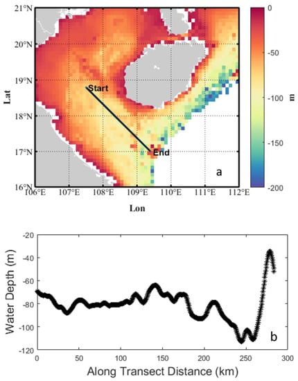 The bathymetry of the study area. (a) The bathymetry around Hainan Island, in the northwest of the South China Sea. The color shading is the water depth. Areas with bathymetry deeper than 200 m are not plotted. The black line is a transect made across the wind wake. (b) The bathymetry along the transect.
