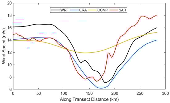 Concerning the variation of the wind speed across the wind wake, curves from ASAR, WRF, CCMP, and ERA5 along the transect (as in Section 2.1) are shown (Figure 2). All datasets could capture the low-speed feature across the wake consistently, with the minimum wind speed occurs between 150~200 km along the transect. The curve along the transect from ASAR-derived wind shows the finest features, while the WRF simulation tends to overestimate the wind speed shear, and the CCMP wind speed shows weakened variation.