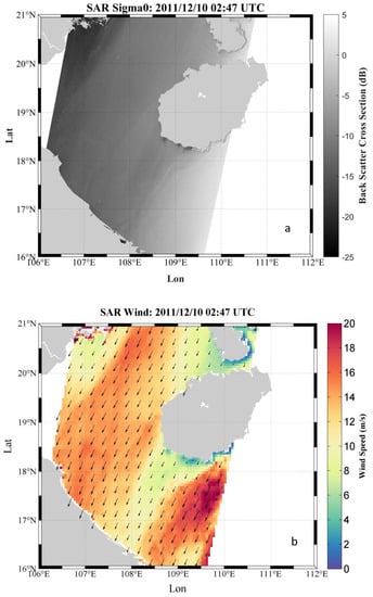 The Envisat/ASAR data (02:47 UTC of December 10th, 2011) in wide swath mode (WSM) was used to retrieve the sea surface wind field. ASAR WSM data were not highly acquired within our study area during winter. The presented case is a good enough example to show a clear wind wake pattern downstream of the island and is thus used for further analysis in this study. The ASAR is one of 10 instruments onboard the Envisat satellite, operating at C-band in a sun-synchronous orbit at an altitude of 800 km. The WSM is one of ASAR’s five imaging modes, and the swath width is approximately 400 km with the pixel size of 75 m [].