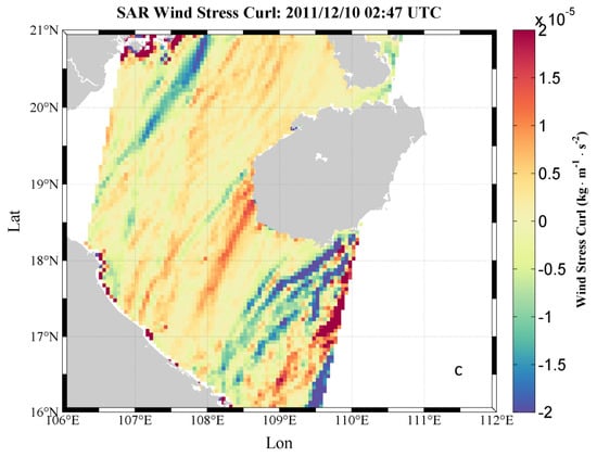 A high-resolution ASAR image captured at 02:47 (UTC) on December 10, 2011 and the retrieved sea surface wind field present the capability of capturing sub-mesoscale features of the wind wake. Due to the incidence angle, the whole image shows a light-to-dark trend from the lower right corner to the top left corner. The wind wake is indicated as a darker-than-ambient footprint (Figure 3a) to the southwest side of the island, extending about 200 km from the island to the coast of Vietnam, covering most of the southern entrance of Beibu Gulf. The dark area (low NRCS) corresponds to reduced sea surface wind speeds over the wake footprint, which is about 10 m/s lower than ambient waters (Figure 3b), with the minimum wind speed very close to the coast. Enhanced positive/negative wind stress curl is also found close to the footprint boundary in the retrieved wind stress curl map (Figure 3c), forming sub-mesoscale wind curl stripes extending in the offshore direction.