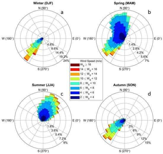 Seasonal wind rose diagrams with WRF wind vectors from 2011 to 2014. Results are for (a) winter, (b) spring, (c) summer, and (d) autumn respectively. The wind direction is defined as the direction of the wind vector pointing towards and departs from the east (0°) cyclonically. Land areas are excluded. Color shading indicates the wind speed, with a speed interval of 2 m/s.
