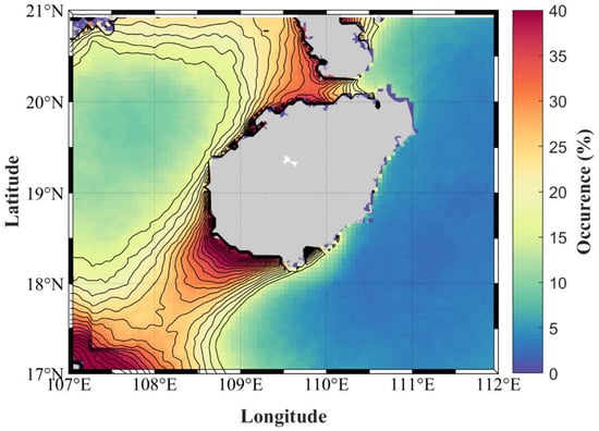 HIWW is expected to show a controlled distribution corresponding to the varying wind, which can be represented by the occurrence of anomalous wind speeds (Figure 5) 2 m/s lower than the regional average. The thresholds of other values less than 5 m/s hold consistent distribution patterns. Three areas with high occurrences of anomalous wind are found in the study area: one locates on the southwest coast of Hainan Island in winter, corresponding to the known wind wake footprint. Another one is located on the northwest coast of Hainan, due to the southerly wind in summer. Also, there is one close to the Vietnam coast at the lower-left corner (17°N, 107°E), which is likely due to the interaction between the southwesterly wind and the Vietnamese orography []. No occurrence was observed to the east of 110.5°E. In comparison to the northwest Hainan coast, the high occurrence in the southwest coast covers a larger area and larger magnitude, being consistent with the regional monsoon character that the northeasterly wind is strongest and steady from October to January (Figure 4).