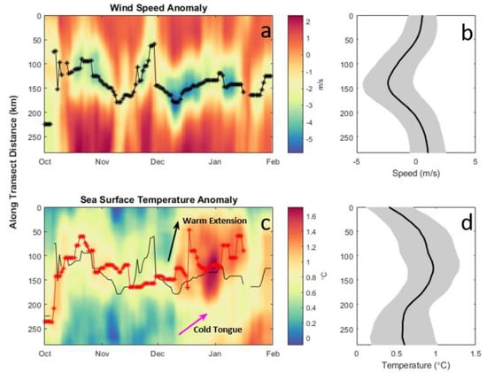 For the SST anomaly (SSTA) along the transect (Figure 6c,d), three features are noted here: firstly, a warm band is observed through the study period collocating with the wind wake pattern. Secondly, the SSTA warm band shows an asymmetric feature comparing with the wake footprint. The warm band covers a larger area than the wind speed band, extending in NWS of the wake. 65% of SST local maxima (red line in Figure 6c) locate within a shorter along transect distance than that of the wind speed minima. Specifically, SSTA with an elevated temperature of at least 0.9 °C is observed on the NWS during December and January (black arrow in Figure 6c). Thirdly, areas in SES (along a transect distance ≥ 200km) keeps reduced temperature steadily during the study period, even forming a cold tongue (magenta arrow in Figure 6c) to the southeast of the warm band from the middle of December until the end of January.
