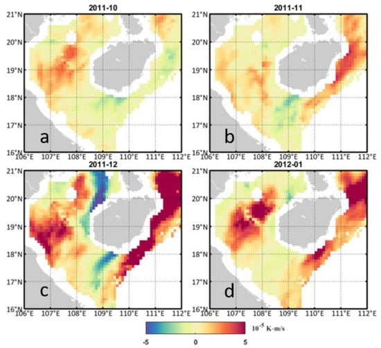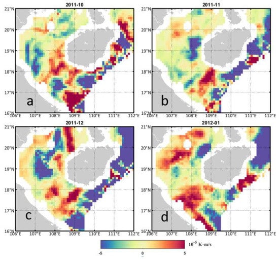 One question then arises naturally as what causes the observed asymmetric SSTA spatial variability. The reduced latent heat flux from the seawater to the atmosphere resulting from the decreased wind speed has been proposed as the forming mechanism of the warming SSTA band []. However, the sea surface heat flux solely could not explain the observed warming extension beyond the wind wake. Also, as shown by the retrieved wind stress curl from ASAR data (Figure 3c), a positive wind stress curl occurs on the NWS, which could bring the cooler bottom water, if any, up to the surface []. Obviously, the cooling process by upwelling is conflicting with the observed warming extension. The most possible mechanism for this is the redistribution of seawater heat induced by the oceanic heat advection, which is further investigated later on.