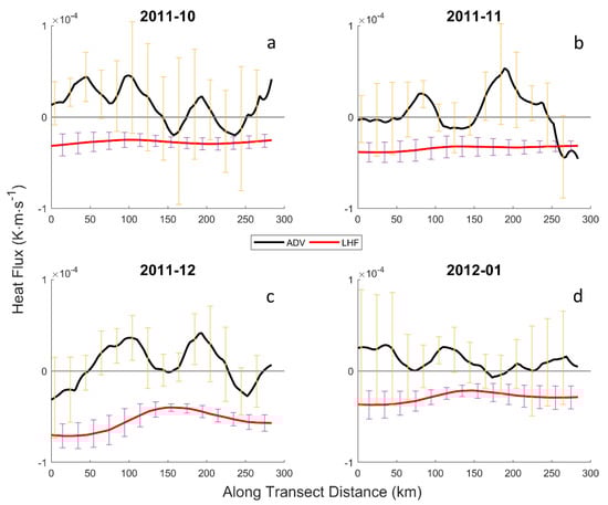 Heat flux terms along the transect averaged over the study period from 2011/10/01 to 2012/01/31. The comparison is made between ADV (black line) and LHF (red line). Uncertainties of two standard deviations within each month are indicated as the length of error bars. The monthly averaged values are shown for (a) October of 2011, (b) November of 2011, (c) December of 2011, and (d) January of 2012.