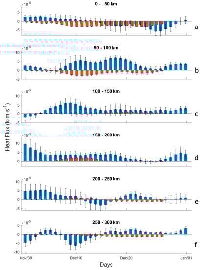 A scaling analysis could be further applied considering the warming rate difference  between two locations in the transect. Derived from Equation (7), we have . If we take the starting point at 0 km along the transect as a reference of ambient water, and assume that areas with a transect distance of 50 ± 10 km, 150 ± 10 km, and 250 ± 10 km represent the area of extended warming band out of the wake, the central warming band within the wake, and the cold tongue on the SES, respectively, then the heat flux difference from values at 0km could be estimated (Table 2) As analyzed in previous sections, the averaged values could indicate the temporal-integrated effects, while the uncertainty mostly corresponds to the temporal variations. Quantitatively, we could identify that the geostrophic ADV (Geo. ADV) dominant the warming of area 50 ± 10 km, and Ekman ADV dominant the cooling of area 250 ± 10 km. The ADV terms are important in shaping the boundary of the warm band, though the Ekman ADV and Geo. ADV tend to compensate for each other.