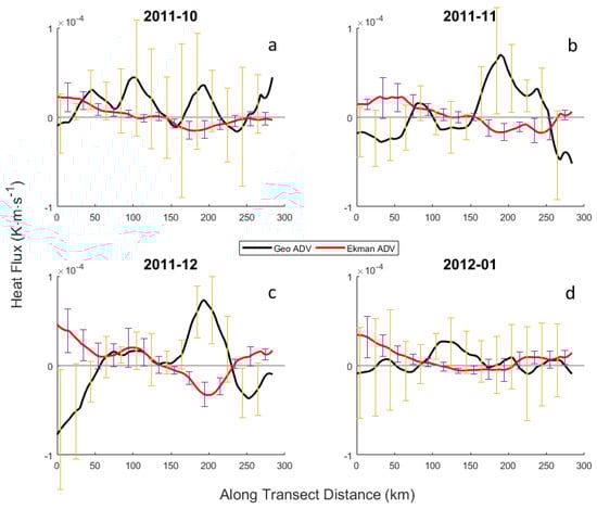 Heat advection terms comparison along the transect averaged over the study period from 2011/10/01 to 2012/01/31. The comparison is made between the geostrophic heat advection (black line) and the wind-driven Ekman heat advection (red line). The monthly averaged values are shown for (a) October of 2011, (b) November of 2011, (c) December of 2011, and (d) January of 2012.The error bar along curves represent two times of temporal standard deviation within each month.