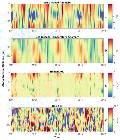 Multi-year time series along the transect from 2011 to 2014. Four variables are plotted including (a) wind speed anomaly, (b) SSTA, (c) Ekman advection, and (d) geostrophic advection.