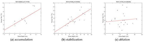 Figure 5a,b, the snow temperature at the air/snow interface was assumed to be equal to the air temperature; thus, the difference between the air temperature and the snow temperature increases linearly with an increase in SD. The rate of change of the snow temperature slope gradually decreases with time, meaning that the difference between air temperature and snow temperature becomes smaller from snow accumulation to snow ablation. As shown in