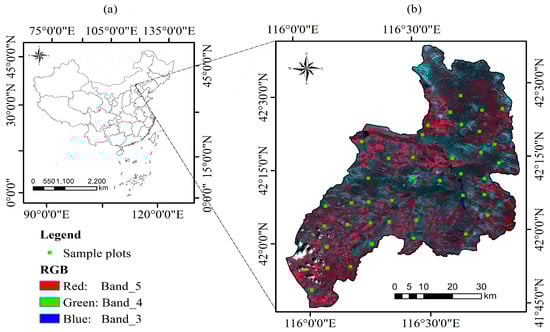 (a) Location of the study area, Duolun county, (b) shown by a Landsat operational land imager (OLI) composition image consisting of band 5 (red), band 4 (green), and band 3 (blue), with locations of 1000 m × 1000 m sampled blocks (solid green squares).