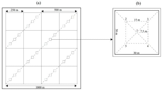 (a) The spatial distribution of 250 m × 250 m and 500 m × 500 m sub-blocks, and 30 m × 30 m sample plots nested within each 1000 m × 1000 m sample block. (b) The allocation of five 1 m × 1 m sub-plots within each 30 m × 30 m sample plot.