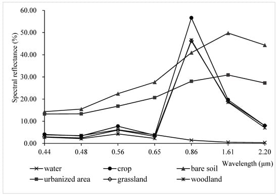 Spectral reflectance curves of six endmembers: woodland, crop, grassland, urbanized area, water, and bare soil.