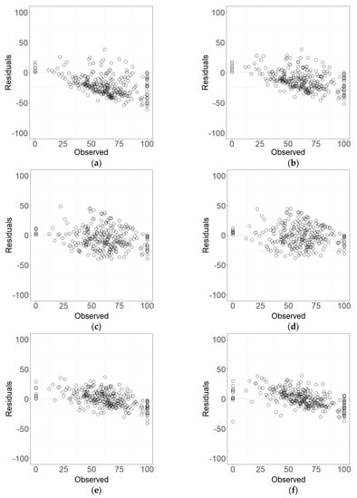 Residuals of predicted PVC graphed against the referenced values for the study area using: (a) LSU without endmember purification; (b) LSU with endmember purification; (c) PBSUA; (d) PBOkNN; (e) RF; and (f) RBFNN.