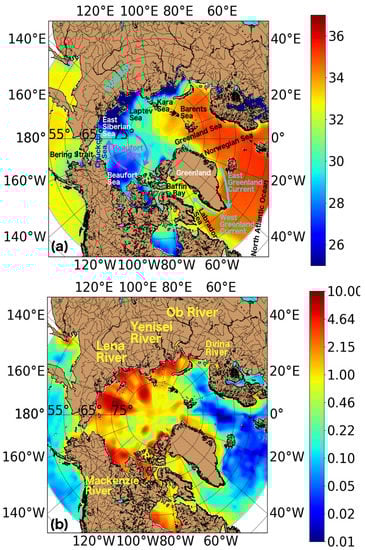 (a) Annual mean of salinity from World Ocean Atlas 13, on top of which are represented the main areas of interest discussed in the study. (b) Standard deviation of the monthly mean of salinity from World Ocean Atlas 13, the main Arctic Rivers are shown on the map. A logarithmic scale is used for the standard deviation map (b).