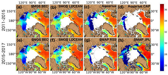 Annual mean of sea surface salinity (SSS) over (a–d) 2011–2015 and (e–h) 2015–2017 from (a,e) SMOS BEC, (b,f) SMOS LOCEAN, (c) Aquarius, (d) Aquarius CAP, (g) SMAP RSS, and (h) SMAP JPL.