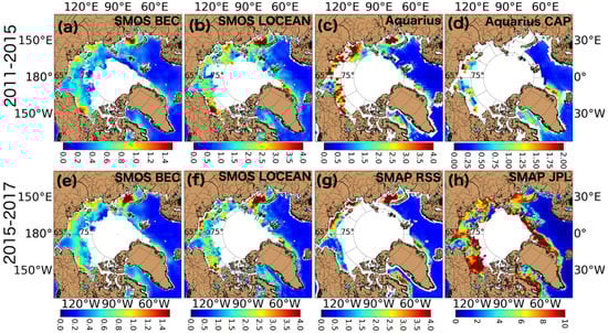 Figure 1a,b show the WOA13 annual mean and standard deviation salinity respectively, over the domain, the Arctic Ocean, on top of which are represented the areas of interest discussed in this study. We first compare several commonly used SSS products with each other in the Arctic Ocean to examine their consistency. As the satellite SSS from different missions cover different time periods, we separate the analysis into two periods: August 2011 to June 2015 (referred to as 2011–2015 hereafter for simplicity) that is common for Aquarius and SMOS data, and April 2015 to December 2017 (referred to as 2015–2017 hereafter for simplicity) that is common for SMOS and SMAP data. Figure 2 shows the spatial distribution of the time mean SSS during these two periods for the six satellite SSS products: SMOS BEC, SMOS LOCEAN, Aquarius, and Aquarius CAP for 2011–2015 and SMOS BEC, SMOS LOCEAN, SMAP RSS, and SMAP JPL for 2015–2017. This time mean is calculated with all the data available, whether there is one or several data available in a pixel through the whole period due to the presence of sea-ice for part of the year.