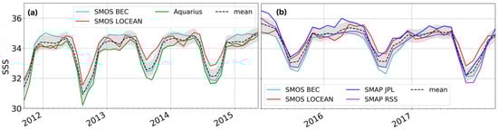 The masking of pixels due to the presence of ice is handled differently for each SSS product. SSS retrievals are not only made in completely ice-free ocean, a small fraction of sea-ice is tolerated over the satellite footprint for the SSS retrieval. For SMOS LOCEAN, the ice mask is based on the dielectric constant and on the ECMWF SST. More details are provided in the SMOS ATBD (https://earth.esa.int/documents/10174/1854519/SMOS_L2OS-ATBD). The SMOS BEC product considers water pixels with a sea-ice concentration lower than 15% by using the EUMETSAT Ocean and Sea-ice Satellite Application Facility (OSI-SAF) sea-ice concentration product. For Aquarius and Aquarius CAP, ancillary 1/12° sea-ice concentration data from NOAA NCEP (https://polar.ncep.noaa.gov/seaice/index.html) are used. The sea-ice concentration is then integrated over the Aquarius satellite footprint and weighted by the antenna gain [33] to obtain an ice fraction. Then, pixels are flagged if the ice fraction exceeds 0.1% for Aquarius and 3% for Aquarius CAP. The Aquarius CAP product provides the ice fraction at each grid pixel whether there is an SSS retrieval or not. An equivalent method is used for SMAP RSS. The daily 0.25 × 0.25° AMSR-E/AMSR2 sea-ice concentration data (http://www.remss.com/missions/amsr/) give an ice flag in each cell (0 = no sea-ice detected, 1 = sea-ice detected). Then, it is integrated over the SMAP footprint and weighted by the antenna gain to give an ice fraction. Pixels are then flagged if the ice fraction exceeds 0.1%. The ice fraction data are provided at pixels where SMAP RSS SSS is retrieved. For SMAP JPL, the ice mask is based on 1/12° NOAA NCEP sea-ice concentration data that are regridded on a 0.5 × 0.5°. For each SMAP footprint, the nearest sea-ice concentration value is found and pixels with a sea-ice concentration exceeding 3% are flagged. The sea-ice concentration is provided at pixels where SMAP JPL SSS is retrieved. In the following, we will refer to the areas where SSS retrievals are performed according to each ice mask as “ice-free” ocean.