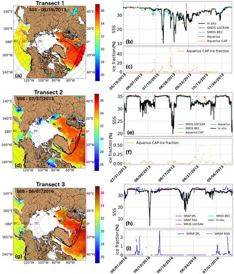 (a,d,g) SMOS BEC SSS maps of 19 May 2013, 31 July 2013, and 1 June 2016 respectively, on top of which, represented as a black solid line, is the TSG transect trajectory starting on each of these days respectively. (b,e,h) SSS from in-situ (black), SMOS BEC (cyan), SMOS LOCEAN (red), Aquarius (green), Aquarius CAP (yellow), SMAP JPL (blue), and SMAP RSS (magenta) along the transect represented on the maps on the left. The ice fraction (in %) from Aquarius CAP, SMAP JPL, or SMAP RSS products along the transect are represented underneath each transect (c,f,i).