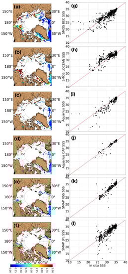 All three SSS missions are based on L-band radiometry, which is a limitation at high latitudes due to the much lower sensitivity to salinity in cold waters [16], resulting in much larger uncertainties in polar oceans than at lower latitudes [16,17]. As shown in Reference [17], such sensitivity drops from 0.5 K/g of salt per kg of seawater to 0.3 K/g of salt per kg of seawater, when sea surface temperature (SST) decreases from 15 °C to 5 °C. However, Arctic SSS variability (both spatial and seasonal) is large [18], and therefore, L-band SSS may still have reasonable capability to detect significant Arctic changes. The paucity of in-situ salinity measurements in the ice-free Arctic Ocean presents a great challenge to the evaluation of satellite SSS in the Arctic Ocean. A few recent studies have attempted to assess the quality of several satellite SSS products compared with in-situ measurements. However, what is still lacking is a systematic evaluation of the full suite of commonly used satellite SSS products in the Arctic Ocean in terms of their consistency among one another and the consistency with in-situ data. The authors of Reference [19] performed a comparison of SMOS and Aquarius products with in-situ measurements and models for the north Atlantic region up to 80°N. They found a root mean square difference (RMSD) of 0.9. However, they did not perform any comparison inside the Arctic Basin. The authors of Reference [20] presented a comparison of three different Aquarius SSS products and one SMOS SSS product in the polar and subpolar oceans. When the products are compared with in-situ measurements, they found RMSD values ranging from 0.33 to 0.89. Overall, the products agree well, although with large biases of 1. Further, the majority of their in-situ data were in the subpolar oceans south of the Arctic Ocean. The authors of Reference [21] assessed the accuracy of only the SMAP SSS product produced by the Jet Propulsion Laboratory (JPL) in the Arctic Ocean through a comparative analysis with in-situ salinity data from Argo floats, ships, gliders, and in-field campaigns. Their results show a RMSD between in-situ and SMAP JPL SSS lower than 1.2 north of 65°N. The authors of Reference [22] presented a new method to retrieve SMOS SSS maps in the Arctic Ocean. They used an extensive database of Argo and thermosalinographs (TSG) data to assess the quality of their product dedicated to the Arctic Ocean. They found that the major features of interannual SSS variations observed by the TSG are also captured by SMOS. They also found a standard deviation of the difference between the new SMOS SSS maps and Argo SSS that ranges from 0.25 to 0.35. Finally, a recent study from Reference [23] assessed the quality of only two SMOS SSS products in the Arctic Ocean from 2011 to 2013 by comparing these products to in-situ data. They found that in the Beaufort Sea, the SMOS product dedicated to the Arctic has the smallest bias (about 0.6) and the smallest RMSD (2.6).