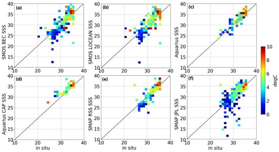 Scatter plots of satellite SSS ((a) SMOS BEC, (b) SMOS LOCEAN, (c) Aquarius, (d) Aquarius CAP, (e) SMAP RSS, and (f) SMAP JPL) against in-situ salinity per 1° bin. The colors represent the mean temperature per 1 × 1.